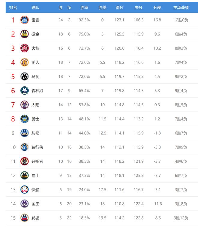 森林狼赢球后17胜9负,继续排名西部第六,国王输球后6胜20负,排名从西部第13掉到第14,今日没有比赛的快船躺升排名,来到西部第13。
