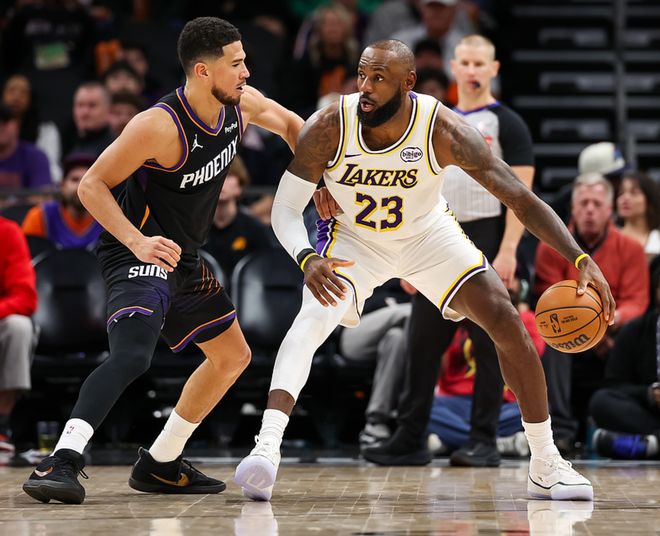 湖人客场挑战太阳,湖人缺少了里夫斯,太阳缺少了杰伦格林,首节比赛太阳取得5分领先,第二节湖人追平分差,第三节太阳一度领先6分,湖人打出一波15-0扭转走势,三节战罢湖人领先9分,第四节湖人一度领先20分,但随后太阳打出强势表现,在比赛还剩12秒时反超1分,詹姆斯造成布克三分犯规,3罚2中反超1分,随后詹姆斯又盖帽了阿伦的抛投,斯马特2罚1中后比赛结束,湖人以2分优势击败太阳。詹姆斯17中8得到26分3板4助2断2帽,东契奇25中7得到29分3板6助,艾顿11中10得到20分13板2断,太阳方面布克17中7得到27分6板7助,马威10中9得到20分6板3帽,狄龙9中6得到18分1板。